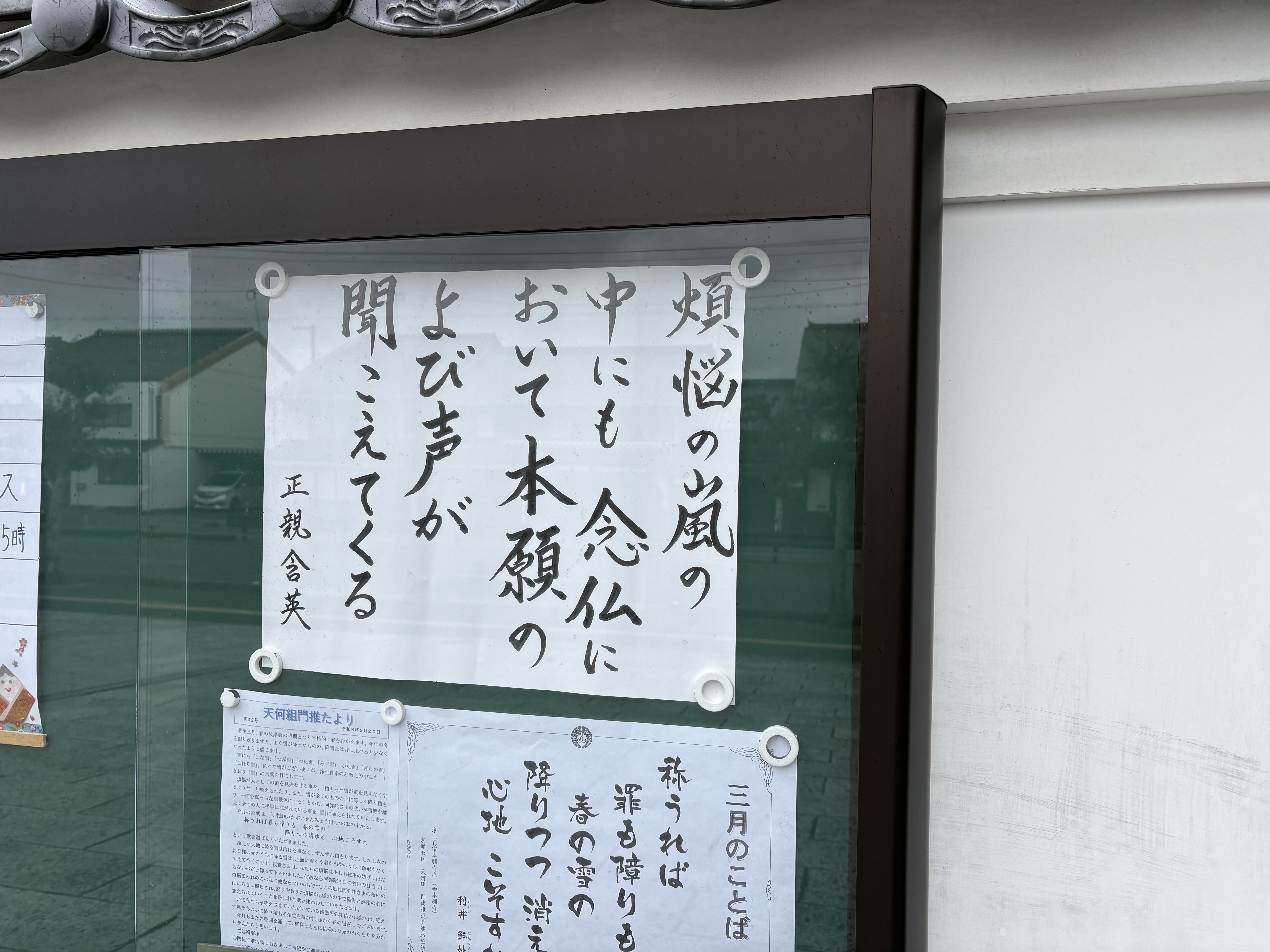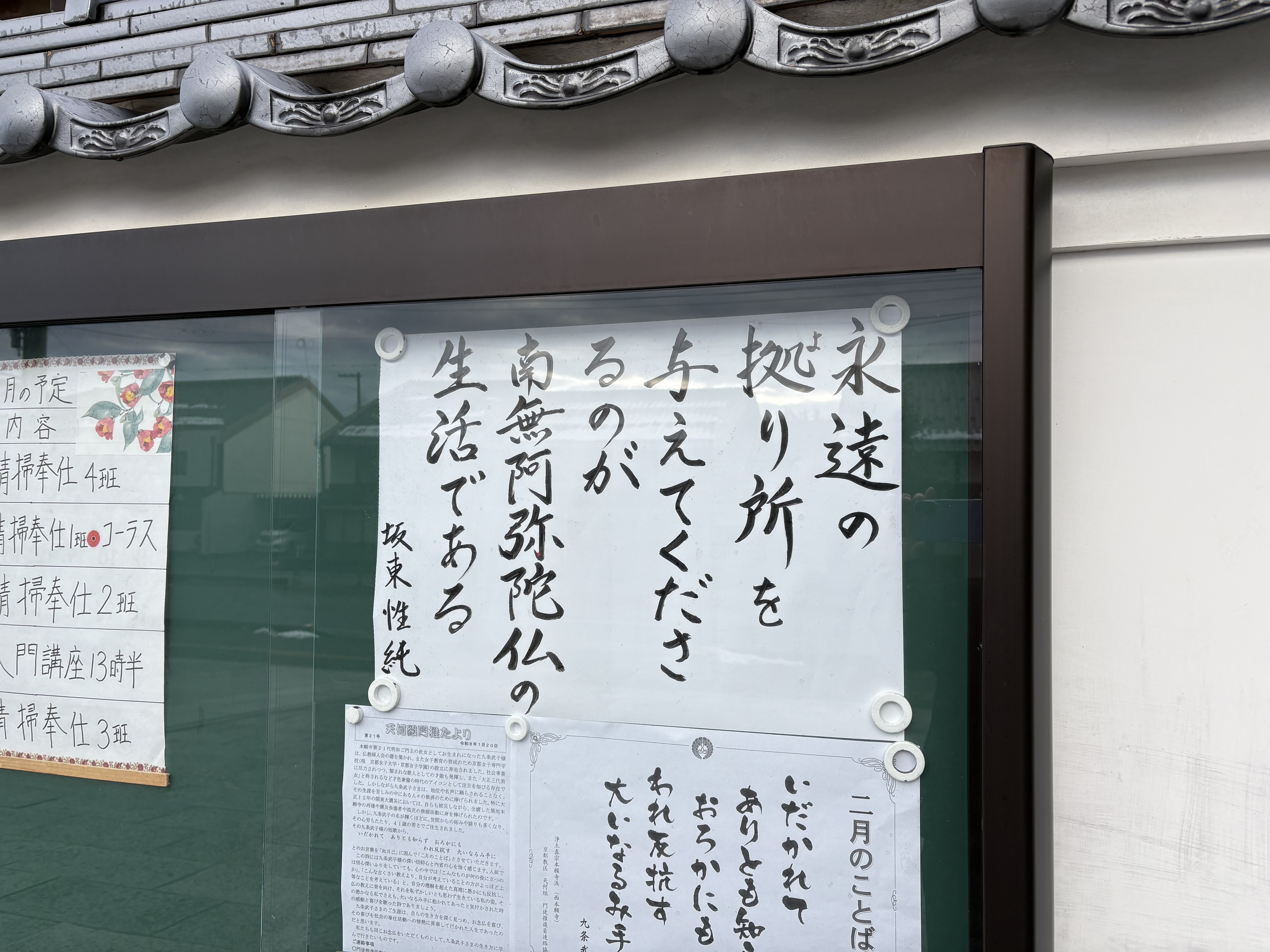明覚寺の駐車場の隅に伝道掲示板があります。浄土真宗のみ教えを深く味わい、お念仏を喜ばれ、お念仏をよりどころとして生き抜かれた、また、お念仏中心の生活を、今送られている方々のお言葉をご紹介しています。