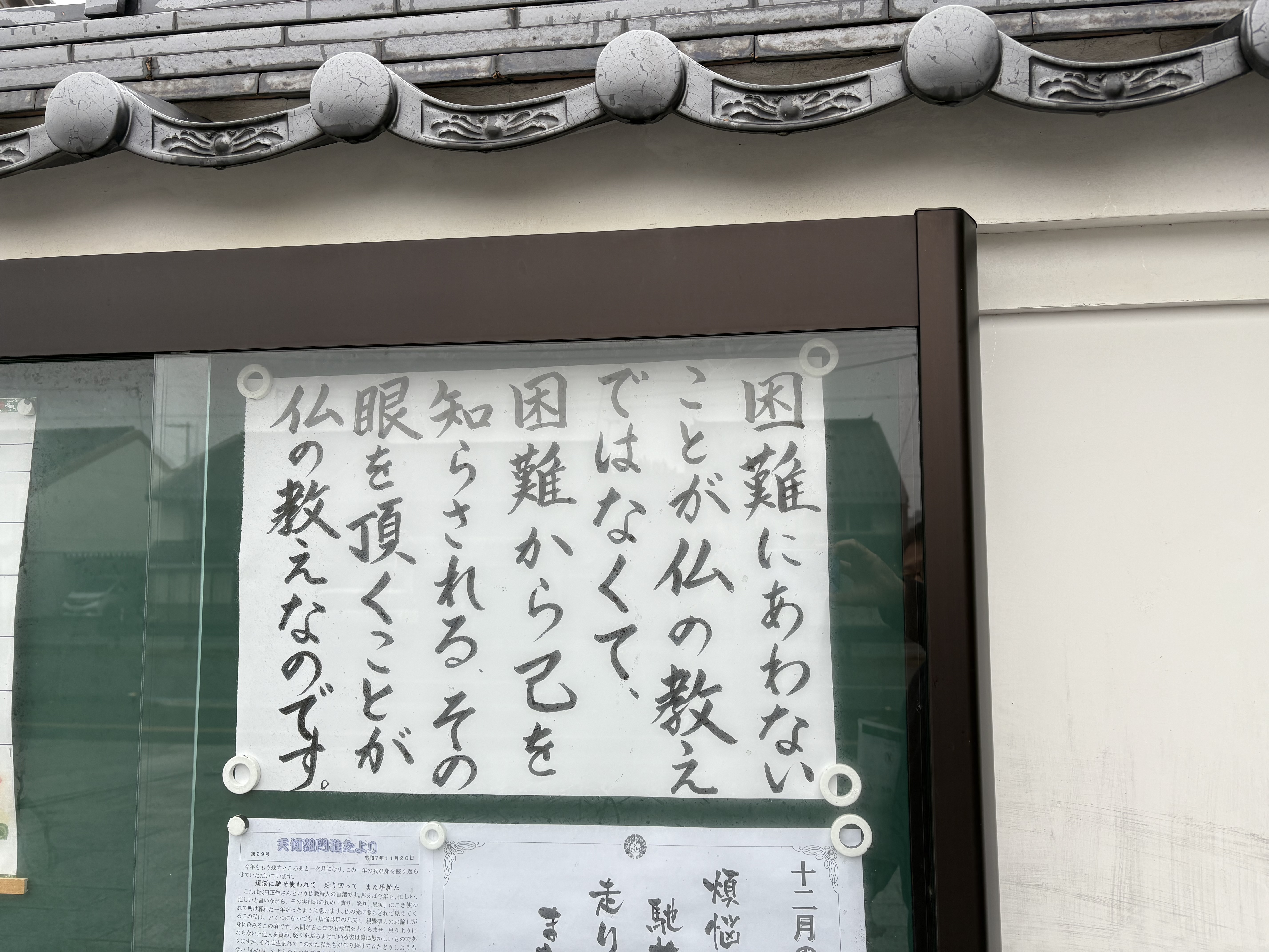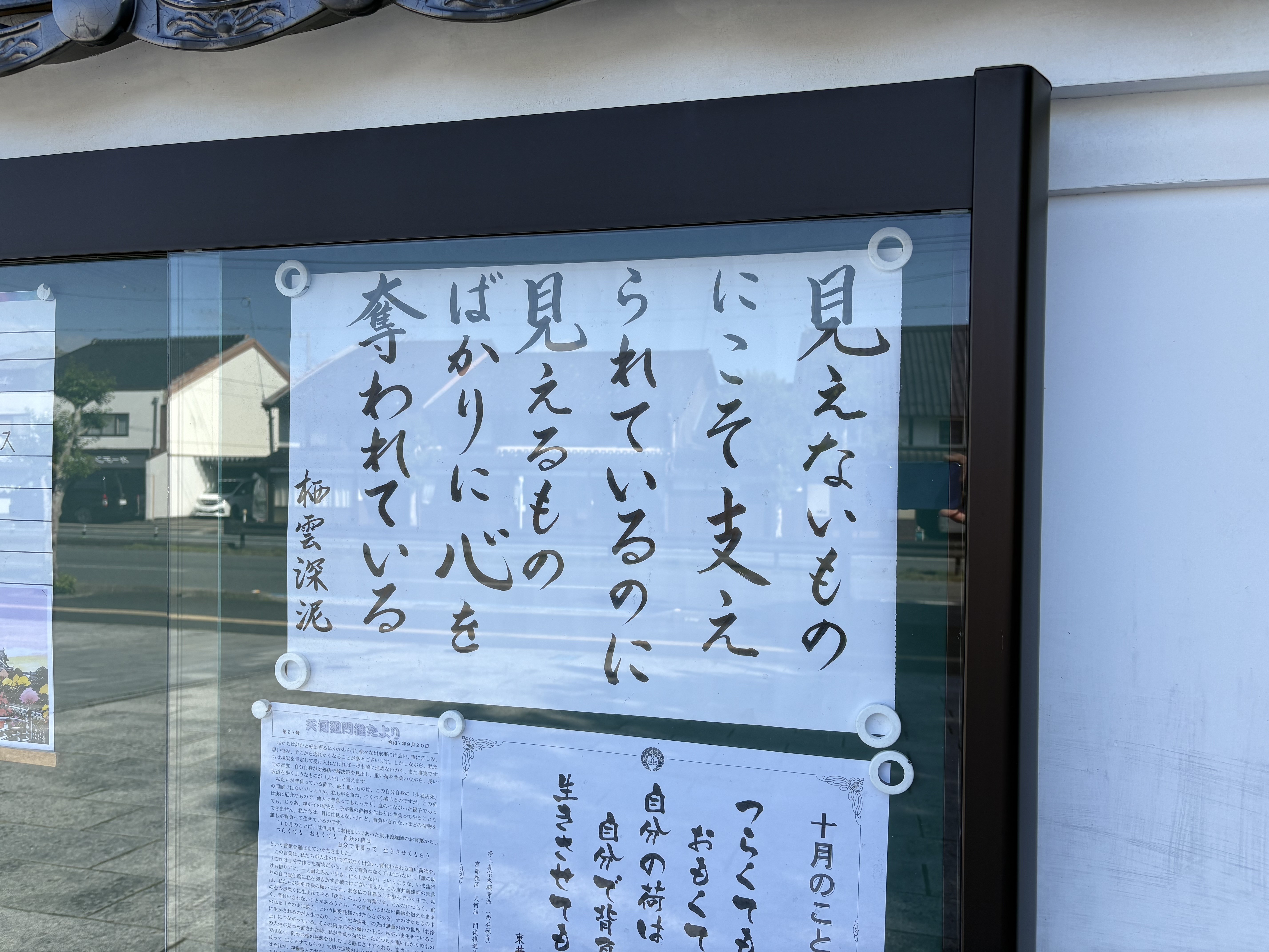 明覚寺の駐車場の隅に伝道掲示板があります。浄土真宗のみ教えを深く味わい、お念仏を喜ばれ、お念仏をよりどころとして生き抜かれた、また、お念仏中心の生活を、今送られている方々のお言葉をご紹介しています。